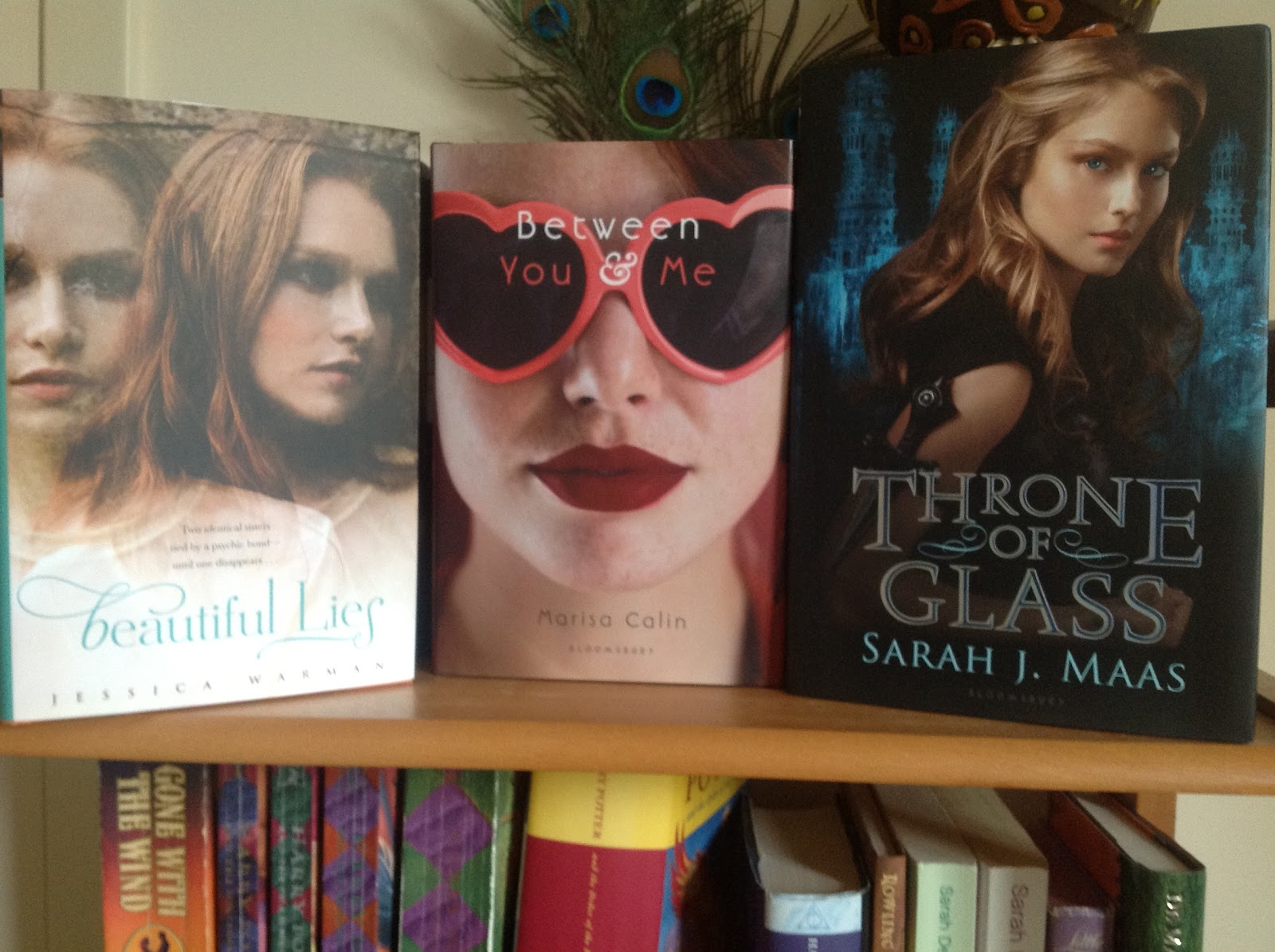 | Beautiful Lies, Between You and Me, and Throne of Glass. Yes, they're on my bookshelf and yes, that is a real peacock feather in the background! |