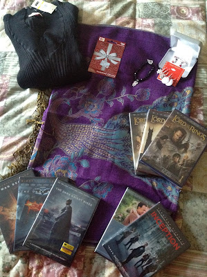 Well, these are all the gifts my family got me. You should know that my parents are firm believers in borrowing books from libraries, not buying them, unless I have a gift card or saved money, so I usually get a variety of other gifts from them that aren't book for Christmas. Generally, my birthday is when I get loads of books! ;) I got a ton of movies this year, including The Dark Knight Trilogy (CHRISTIAN BALE!), Inception, You've Got Mail, and The Lord of the Rings Trilogy (ARAGORN!). I also got a sweater, a peacock shawl, an owl bracelet, a set of holiday earrings, and a $50 Gift Card that I will, undoubtedly, be spending on books!